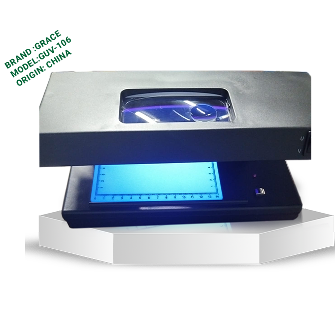 The Grace GUV-106 Fake Note Detector is a reliable desktop machine designed to quickly identify counterfeit banknotes and security documents. It uses UV light, magnetic ink detection, watermark checking, and magnification to verify the authenticity of currency. This multi-function detector can also check passports, ID cards, cheques, and credit cards. With its simple operation and accurate detection system, the GUV-106 is ideal for shops, banks, offices, and cash-handling businesses to prevent fake money transactions.